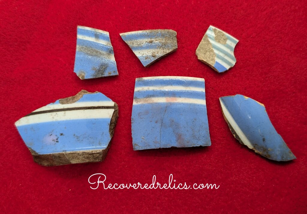 Banded Transferware– An annular decoration found on earthenware. Banded transferware features uniform, precise circles around the body of the piece. Early pieces (late 18th to early 19th century) often used earth tones like ochre, olive green, and rust. After roughly 1840, blue banding became the most common style.